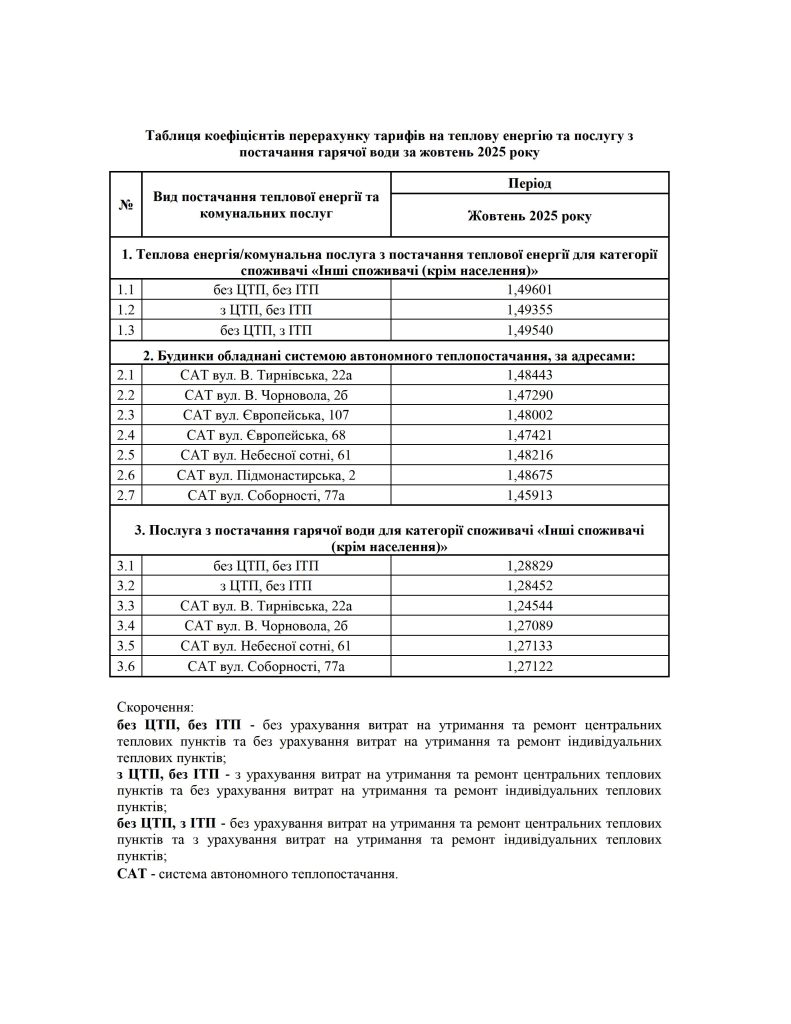 Інформація про нарахування за теплову енергію, послугу з постачання теплової енергії та послугу з постачання гарячої води споживачам категорії «Інші споживачі» за жовтень 2025 року