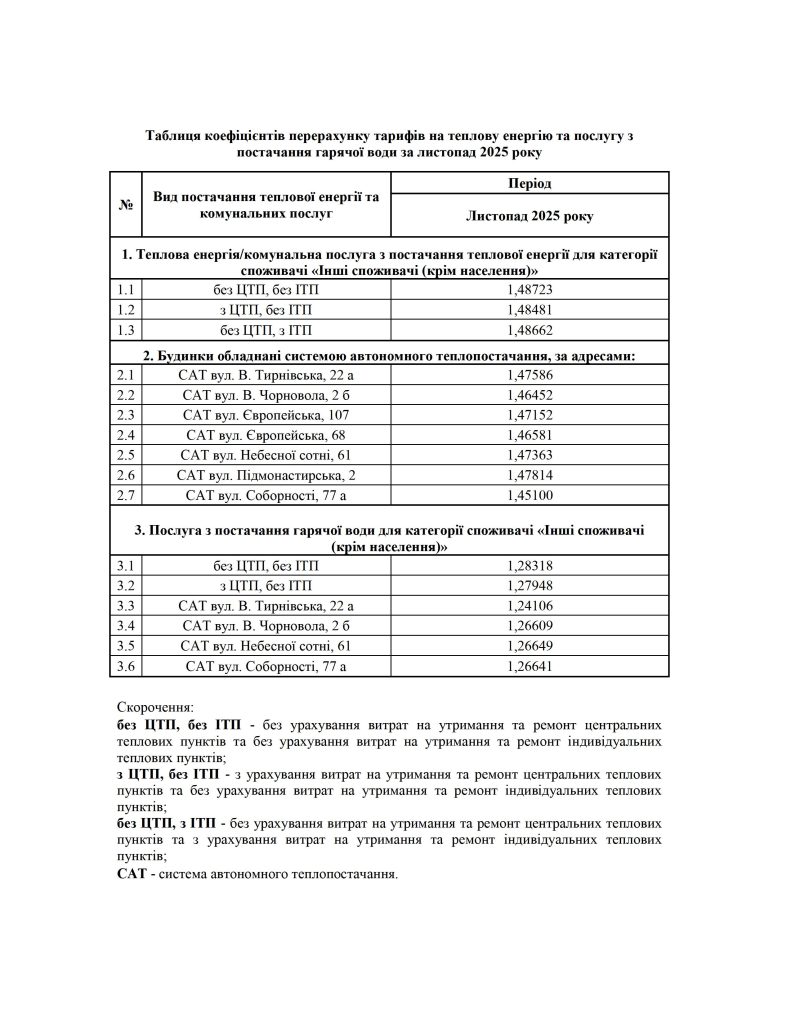 про нарахування за теплову енергію, послугу з постачання теплової енергії та послугу з постачання гарячої води споживачам категорії «Інші споживачі» за листопад 2025 року