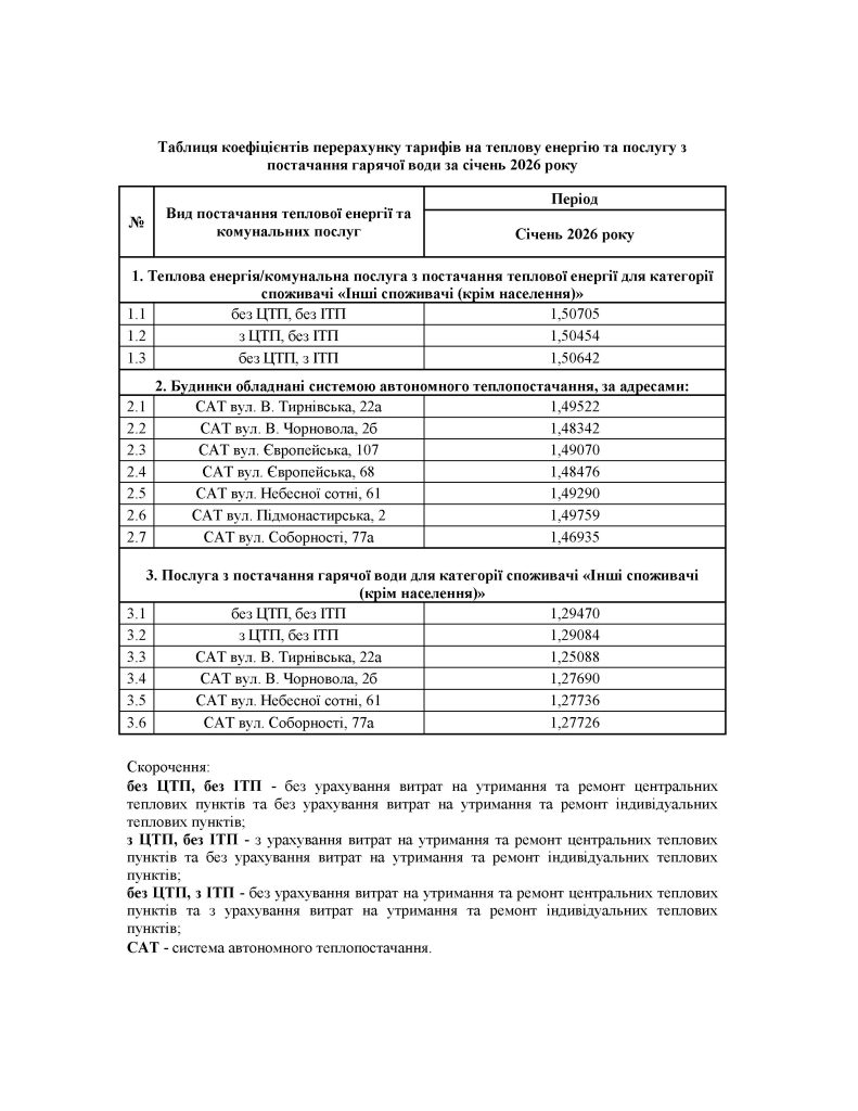 На виконання вищезазначених постанов, підприємством перераховано вартість умовно-змінної частини двоставкового тарифу на теплову енергію, послугу з постачання теплової енергії та послугу з постачання гарячої води з врахуванням наступних коефіцієнтів: