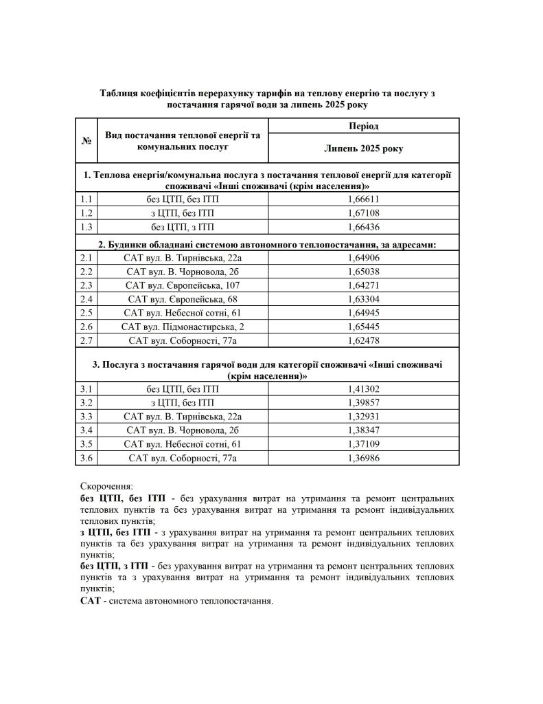 Про нарахування за теплову енергію, послугу з постачання теплової енергії та послугу з постачання гарячої води споживачам категорії «Інші споживачі» за липень 2025 року.