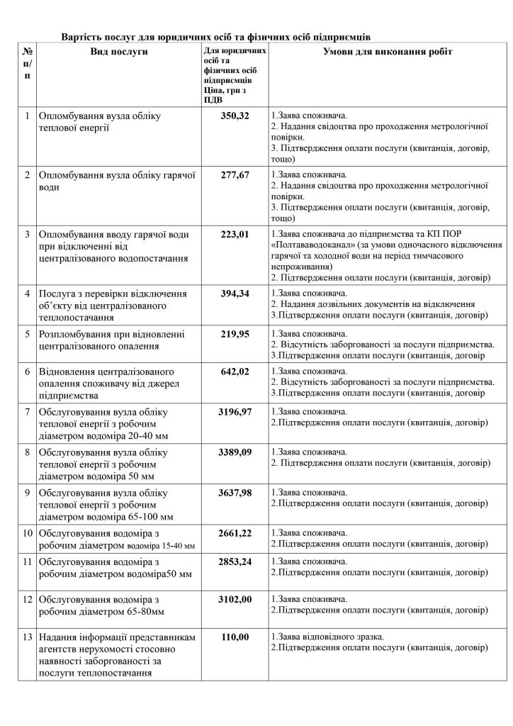 ВАРТІСТЬ послуг ПОКВПТГ «Полтаватеплоенерго» з опломбування/преопломбування вузлів комерційного розподільчого обліку теплової енергії  та води,  перевірки відключень,  та інше для юридичних осіб та фізичних осіб підприємців