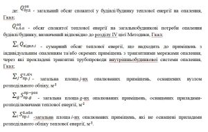 Так, для опалюваного приміщення, оснащеного вузлом розподільного обліку (Qт.лічпр.j), обсяг спожитої теплової енергії на опалення визначається на підставі показань відповідного вузла розподільного облікуз врахуваннямчасткиобсягуспожитоїтепловоїенергії на загальнобудинкові потреби опаленнябудівлі/будинку (Qопз.б.п), щовизначається пропорційно до загальних/опалювальнихплощ/об’ємівцихприміщень, та враховуючивимоги розділів VI, VIІІ цієї Методики