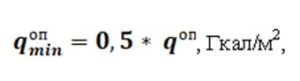 Мінімальна частка середнього питомого споживання теплової енергії (qопmin) дорівнює 50 % від середнього питомого споживання теплової енергії на опалення приміщень (qопmin), тобто: