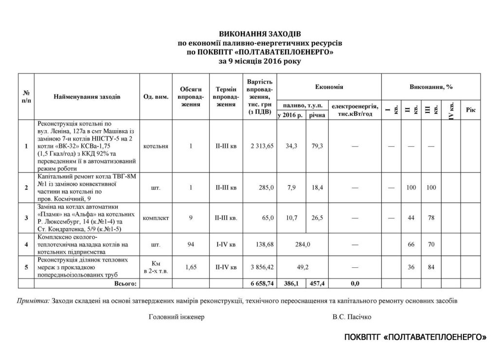 Виконання заходів по економії паливно-енергетичних ресурсів по ПОКВПТГ «ПОЛТАВАТЕПЛОЕНЕРГО» за 9 місяців 2016 року