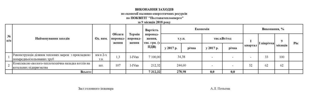 Виконання заходів по економії паливно-енергетичних ресурсів по ПОКВПТГ «ПОЛТАВАТЕПЛОЕНЕРГО» за 9 місяців 2018 року