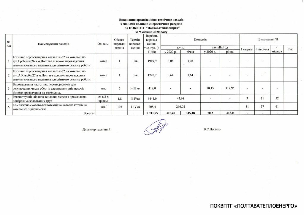 Виконання заходів по економії паливно-енергетичних ресурсів по ПОКВПТГ «ПОЛТАВАТЕПЛОЕНЕРГО» за 9 місяців 2020 року