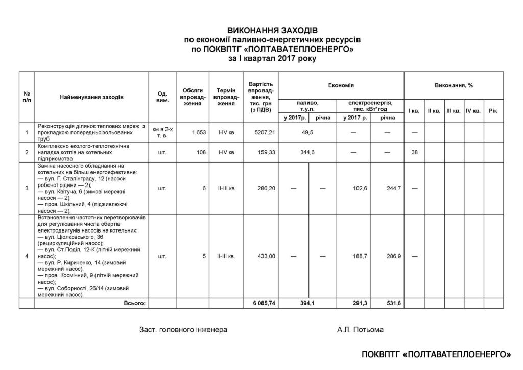 Виконання заходів по економії паливно-енергетичних ресурсів по ПОКВПТГ «ПОЛТАВАТЕПЛОЕНЕРГО» за І квартал 2017 року