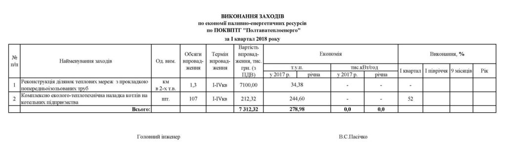 Виконання заходів по економії паливно-енергетичних ресурсів по ПОКВПТГ «ПОЛТАВАТЕПЛОЕНЕРГО» за І квартал 2018 року