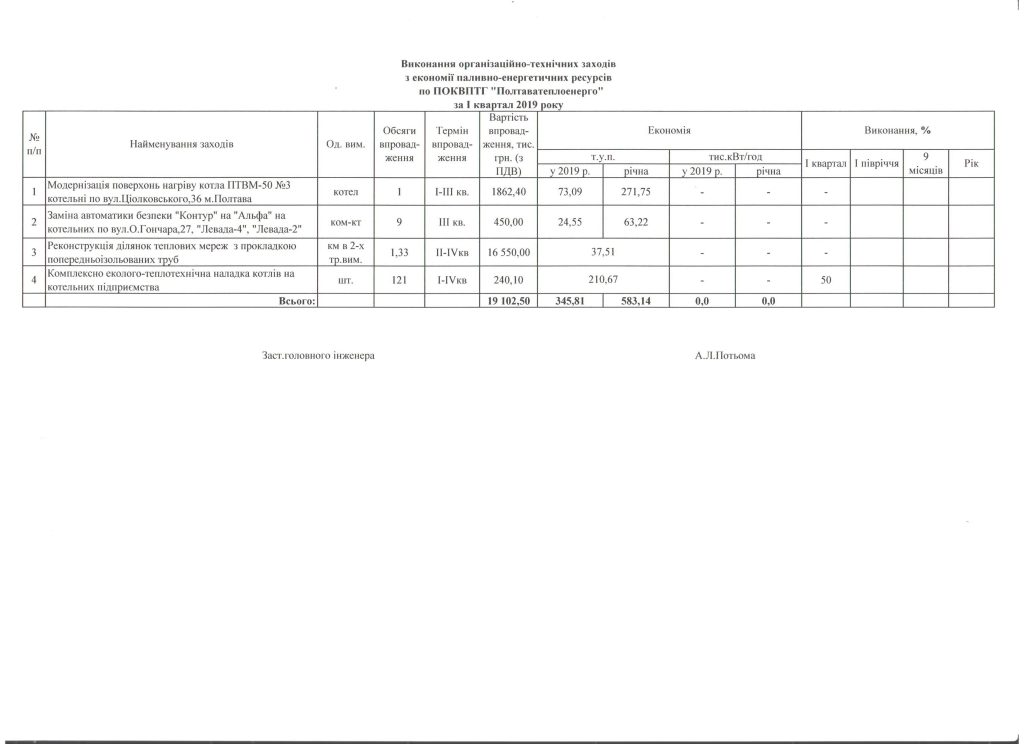 Виконання заходів по економії паливно-енергетичних ресурсів по ПОКВПТГ «ПОЛТАВАТЕПЛОЕНЕРГО» за І квартал 2019 року