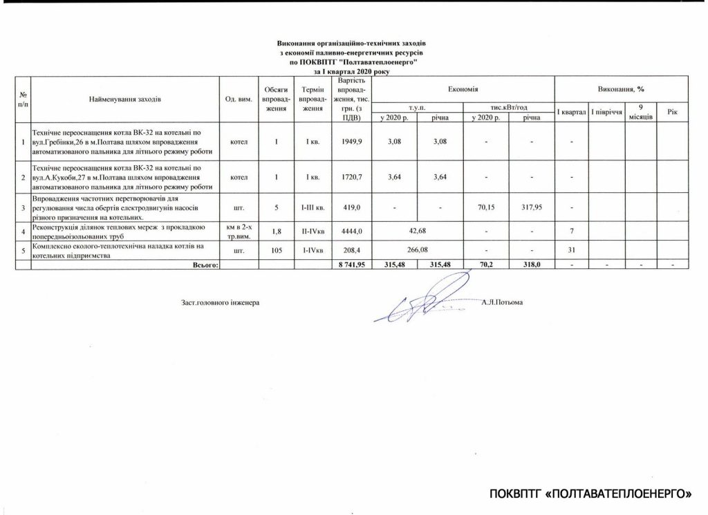 Виконання заходів по економії паливно-енергетичних ресурсів по ПОКВПТГ «ПОЛТАВАТЕПЛОЕНЕРГО» за І квартал 2020 року