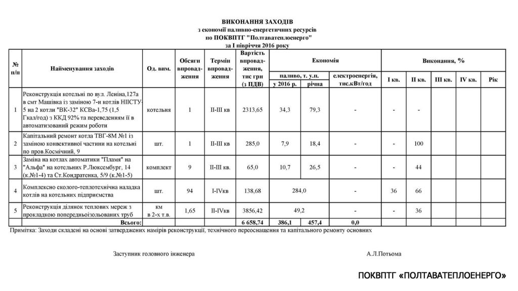 Виконання заходів по економії паливно-енергетичних ресурсів по ПОКВПТГ «ПОЛТАВАТЕПЛОЕНЕРГО» за І півріччя 2016 року