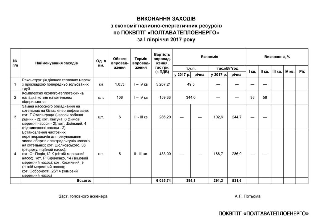 Виконання заходів по економії паливно-енергетичних ресурсів по ПОКВПТГ «ПОЛТАВАТЕПЛОЕНЕРГО» за І півріччя 2017 року
