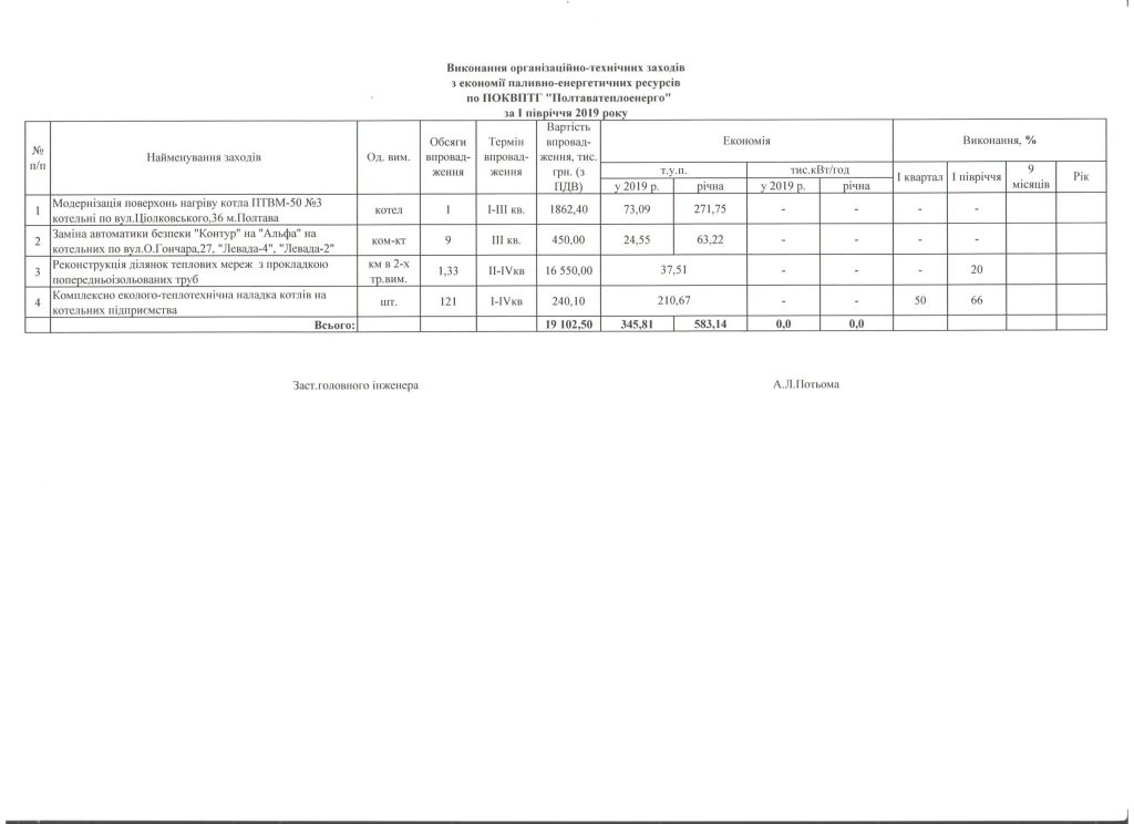 Виконання заходів по економії паливно-енергетичних ресурсів по ПОКВПТГ «ПОЛТАВАТЕПЛОЕНЕРГО» за І півріччя 2019 року