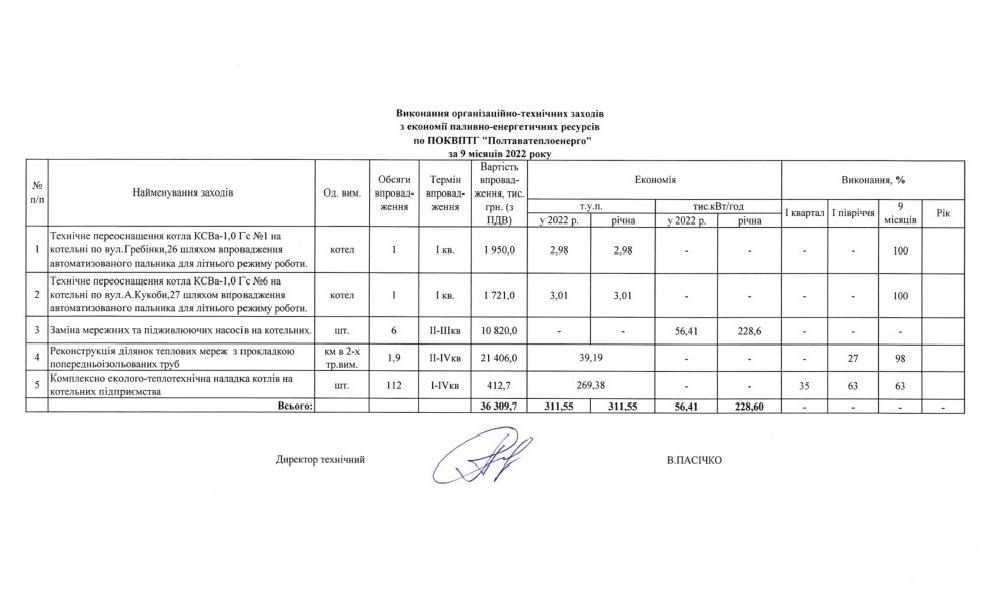 Виконання заходів з економії паливно-енергетичних ресурсів по ПОКВПТГ «ПОЛТАВАТЕПЛОЕНЕРГО» за 9 місяців 2022 року