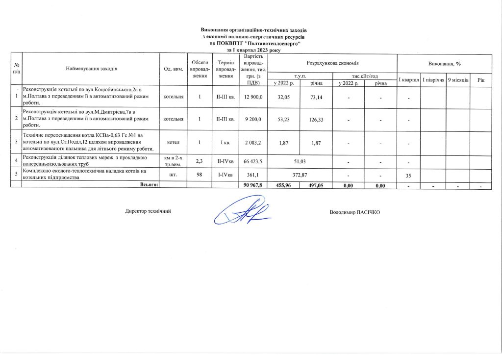 Виконання заходів з економії паливно-енергетичних ресурсів по ПОКВПТГ «ПОЛТАВАТЕПЛОЕНЕРГО» за І квартал 2023 року