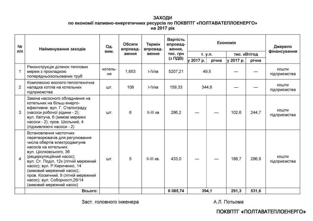 Заходи по економії паливно-енергетичних ресурсів по ПОКВПТГ «ПОЛТАВАТЕПЛОЕНЕРГО» на 2017 рік