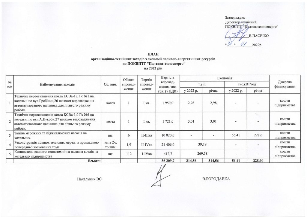 Заходи по економії паливно-енергетичних ресурсів по ПОКВПТГ «ПОЛТАВАТЕПЛОЕНЕРГО» на 2022 рік