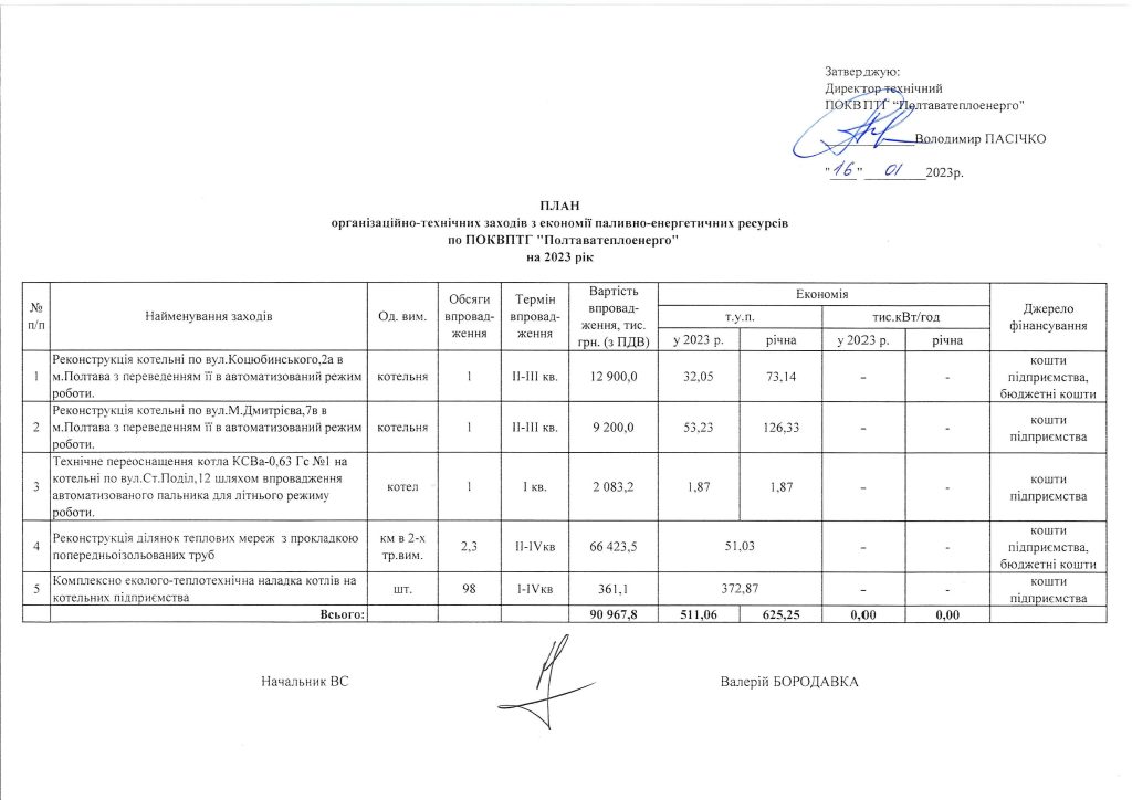 Заходи з економії паливно-енергетичних ресурсів по ПОКВПТГ «ПОЛТАВАТЕПЛОЕНЕРГО» на 2023 рік