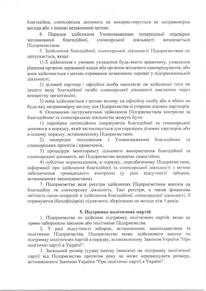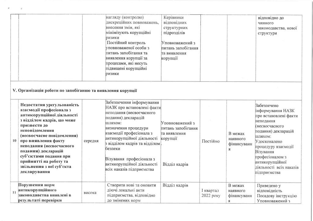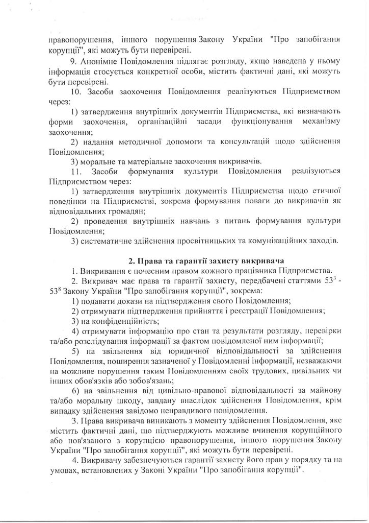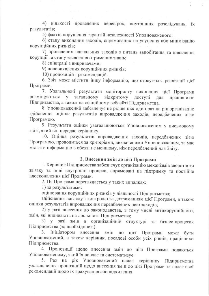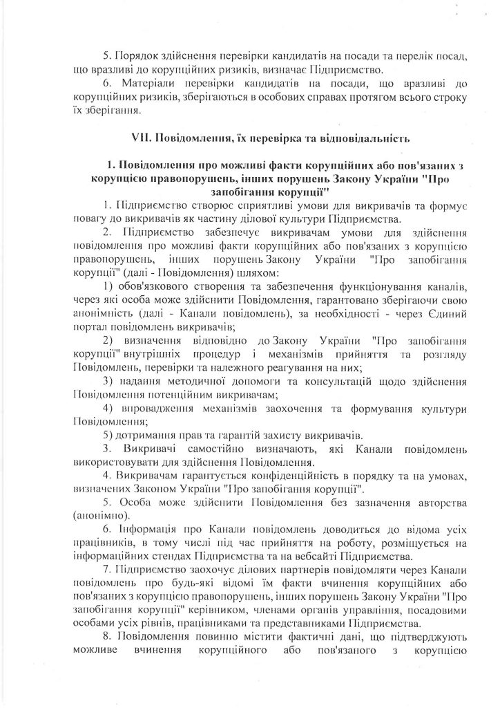 У 2023 році у ньому взяли участь 300 працівників, що становить 29 % від фактичної чисельності персоналу підприємства. Результати анкетування засвідчили, що антикорупційна політика підприємства є повністю або переважно зрозумілою для більшості працівників – 83,5% проти 82,4 % у 2021 році. В порівнянні з аналогічними показниками попереднього року збільшилась на 2,7 % кількість опитаних працівників, яким не відомо про наявні випадки корупції в Компанії (67,4 % у 2023 році проти 65 % у 2021 році). Переважна більшість опитаних працівників вважають достатніми роз’яснення змісту антикорупційного законодавства, що надаються на підприємстві, – 89,9 % проти 10,1 % тих, хто вважає існуючий обсяг роз’яснень недостатнім. Надані за результатами анонімного опитування пропозиції будуть враховані Уповноваженим під час реалізації Антикорупційної програми та удосконалення організаційно-розпорядчої та виробничої документації підприємства з питань запобігання корупції.