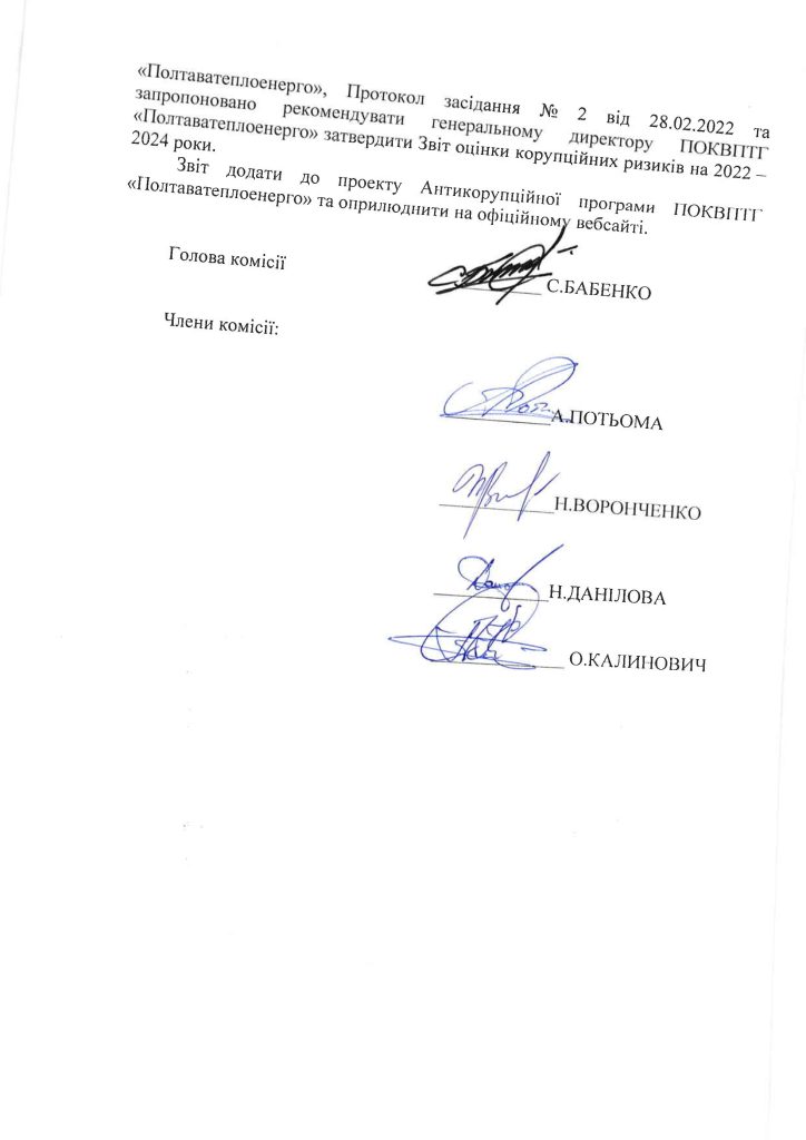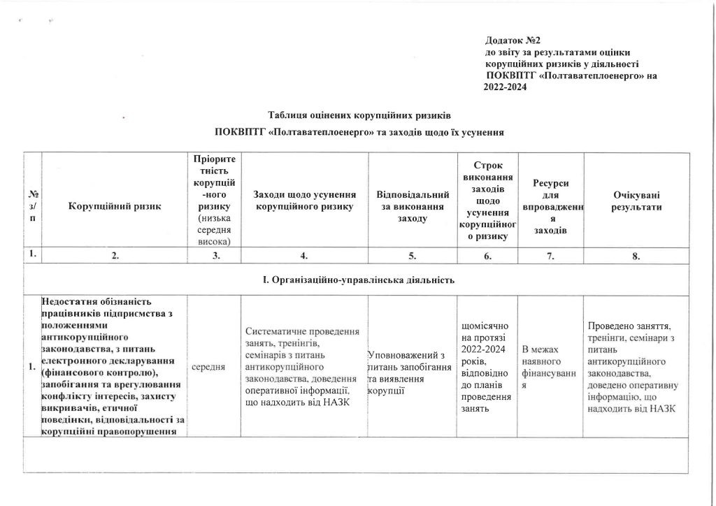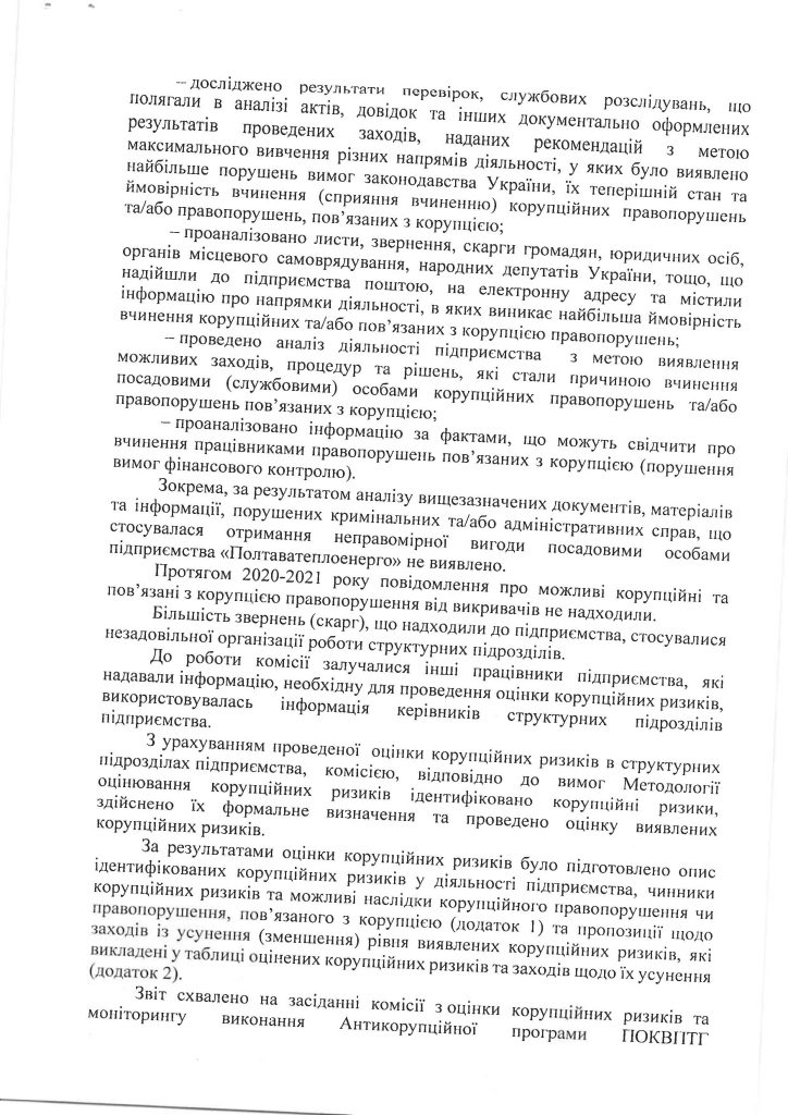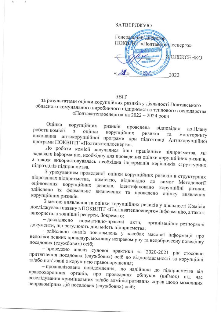 ЗВІТ ЗА РЕЗУЛЬТАТАМИ ОЦІНКИ КОРУПЦІЙНИХ РИЗИКІВ У ДІЯЛЬНОСТІ ПОКВПТГ “ПОЛТАВАТЕПЛОЕНЕРГО” 2022-2024