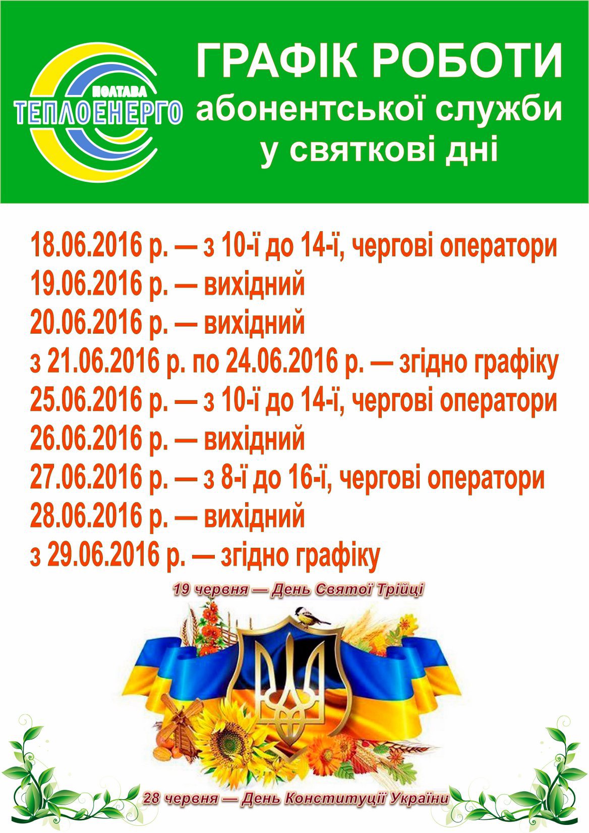 «ПОЛТАВАТЕПЛОЕНЕРГО» НАГАДУЄ: Графік роботи абонентської служби підприємства в період формування рахунків
