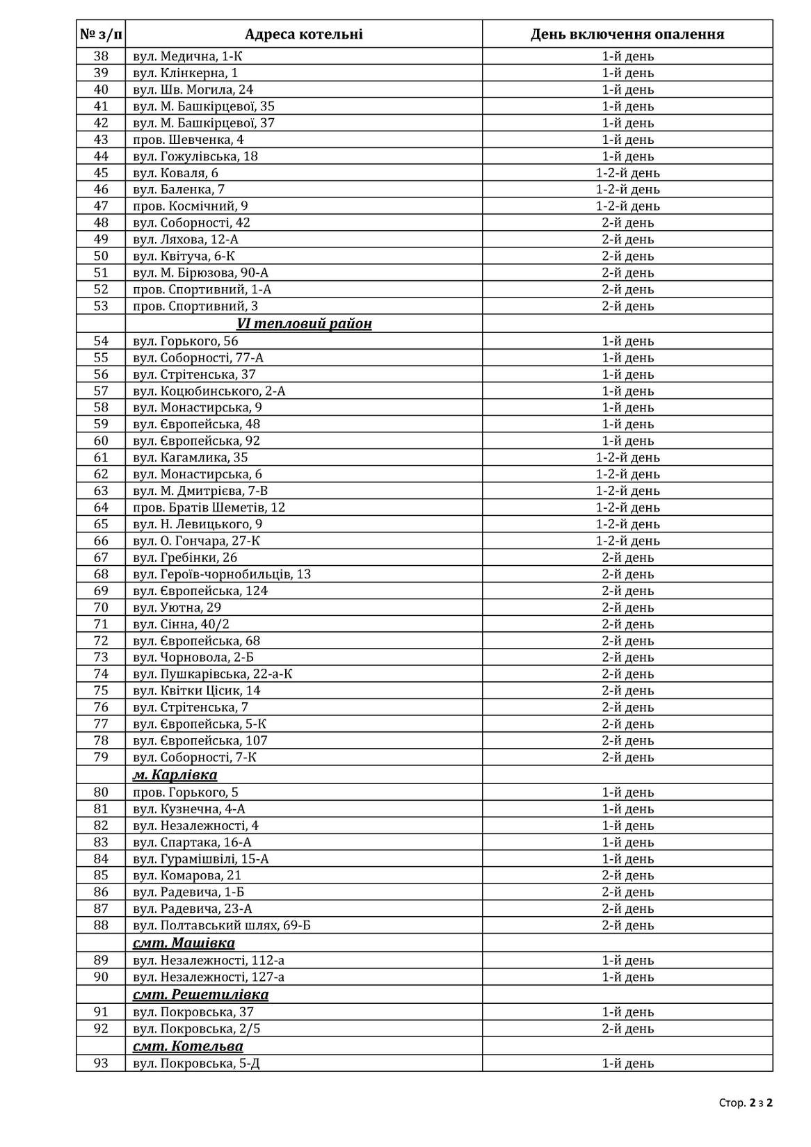 Графік включення опалення, у розрізі котелень підприємства, наведений нижче.