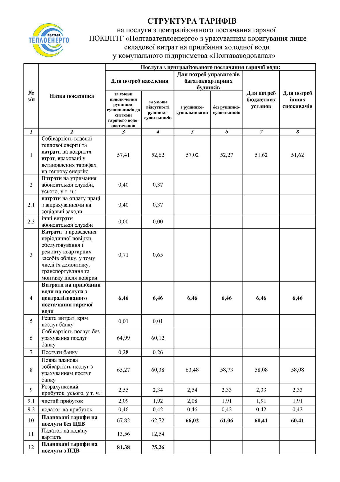 Нижче наводиться структура тарифів на послуги з централізованого постачання гарячої ПОКВПТГ «Полтаватеплоенерго» з урахуванням коригування лише складової витрат на придбання холодної води у комунального підприємства «Полтававодоканал»: