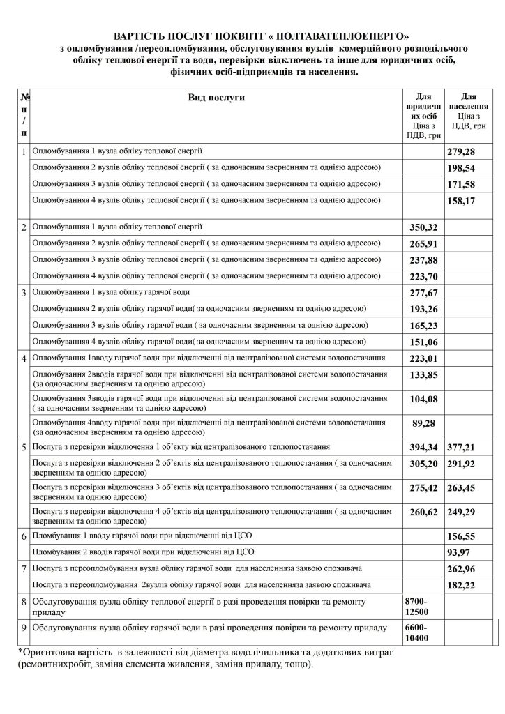 ВАРТІСТЬ ПОСЛУГ ПОКВПТГ «ПОЛТАВАТЕПЛОЕНЕРГО» з опломбування/преопломбування вузлів комерційного розподільчого обліку теплової енергії та води, перевірки відключень та інше для юридичних осіб, фізичних осіб-підприємців та населення