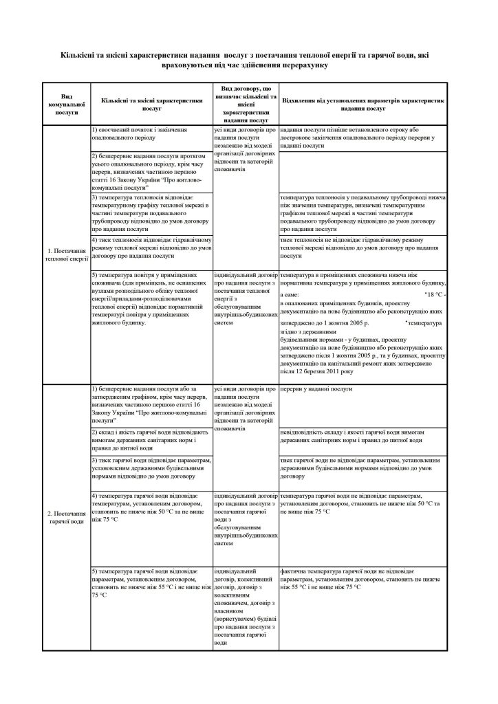 Кількісні та якісні характеристики надання  послуг з постачання теплової енергії та гарячої води, які враховуються під час здійснення перерахунку