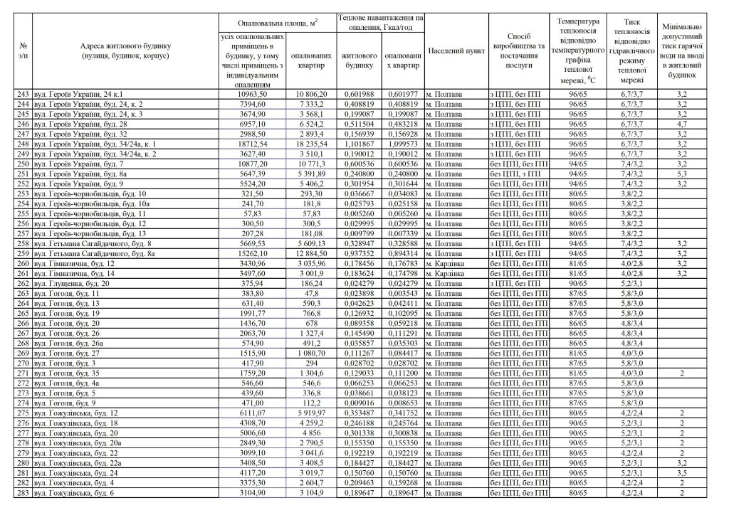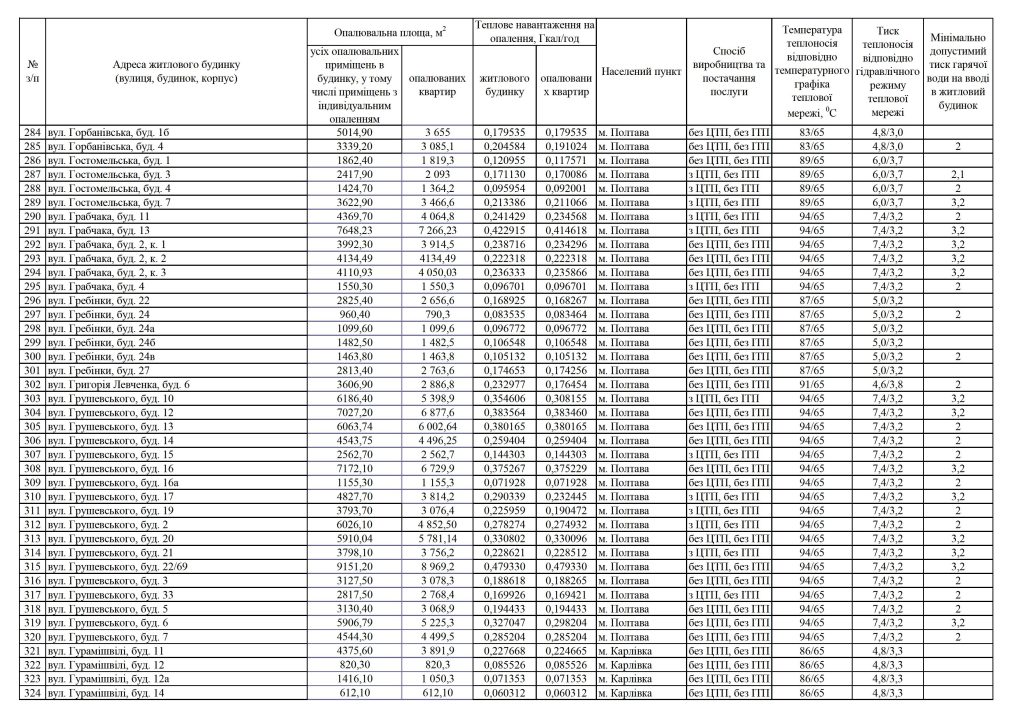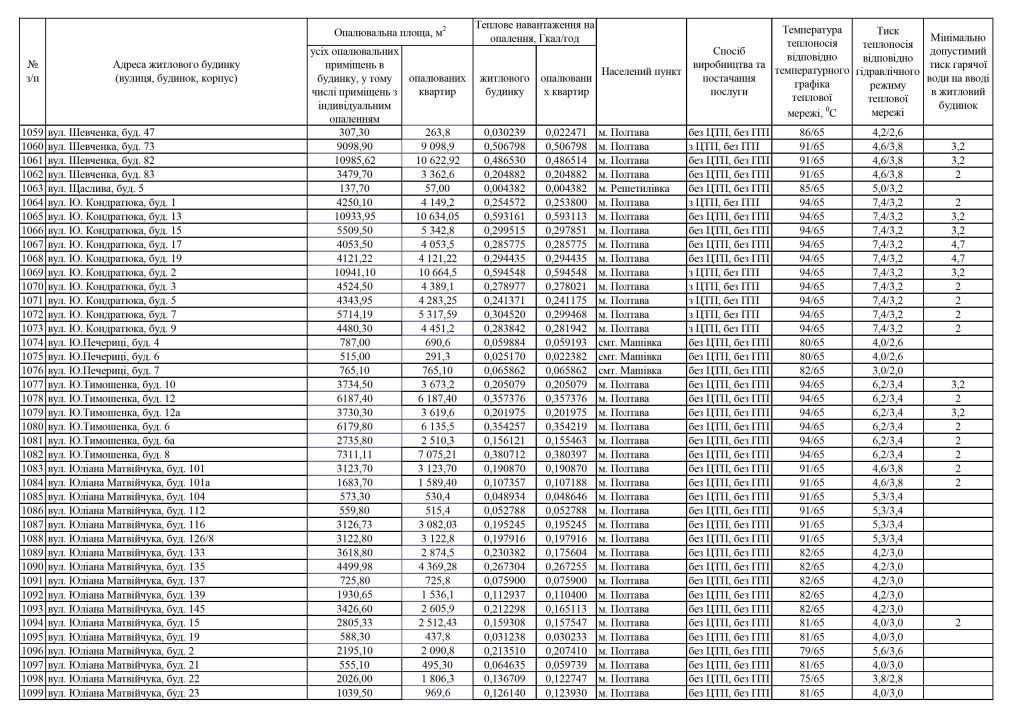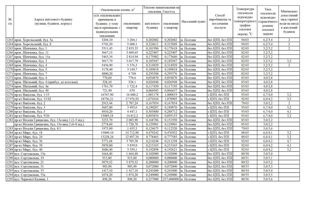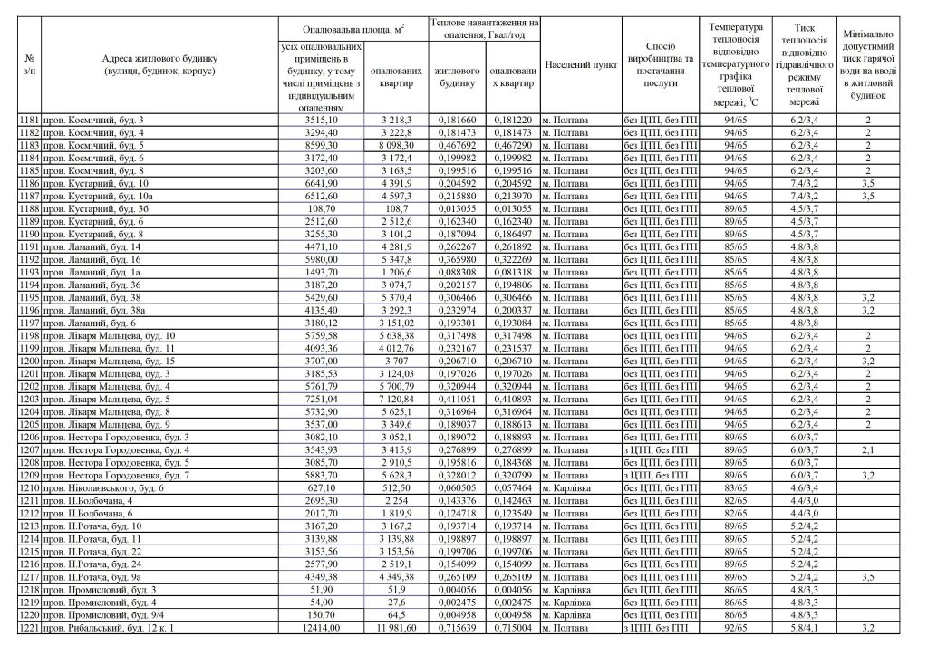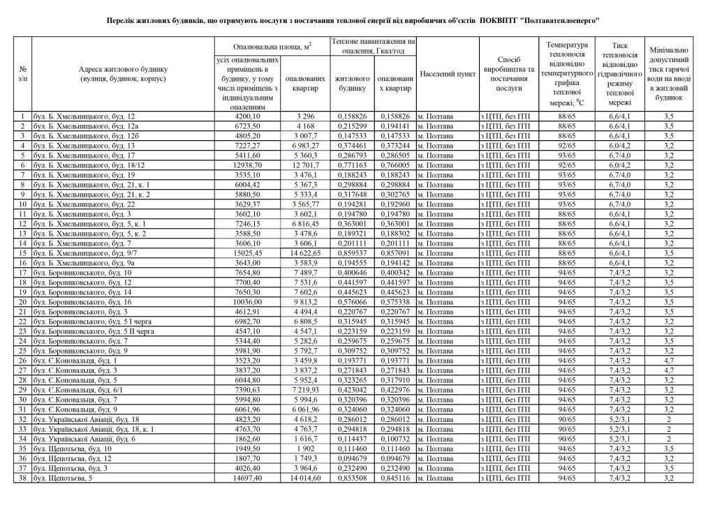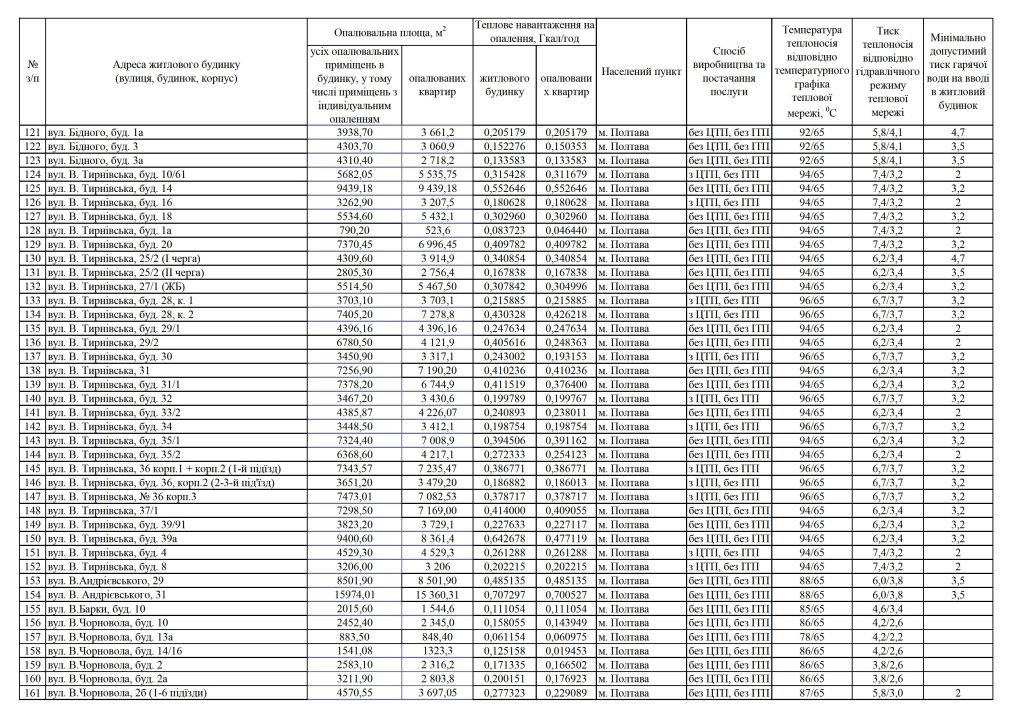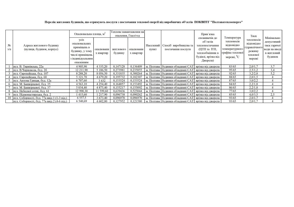 ПЕРЕЛІК ЖИТЛОВИХ БУДИНКІВ, що отримують послуги з централізованого теплопостачання від виробничих об’єктів ПОКВПТГ «Полтаватеплоенерго»